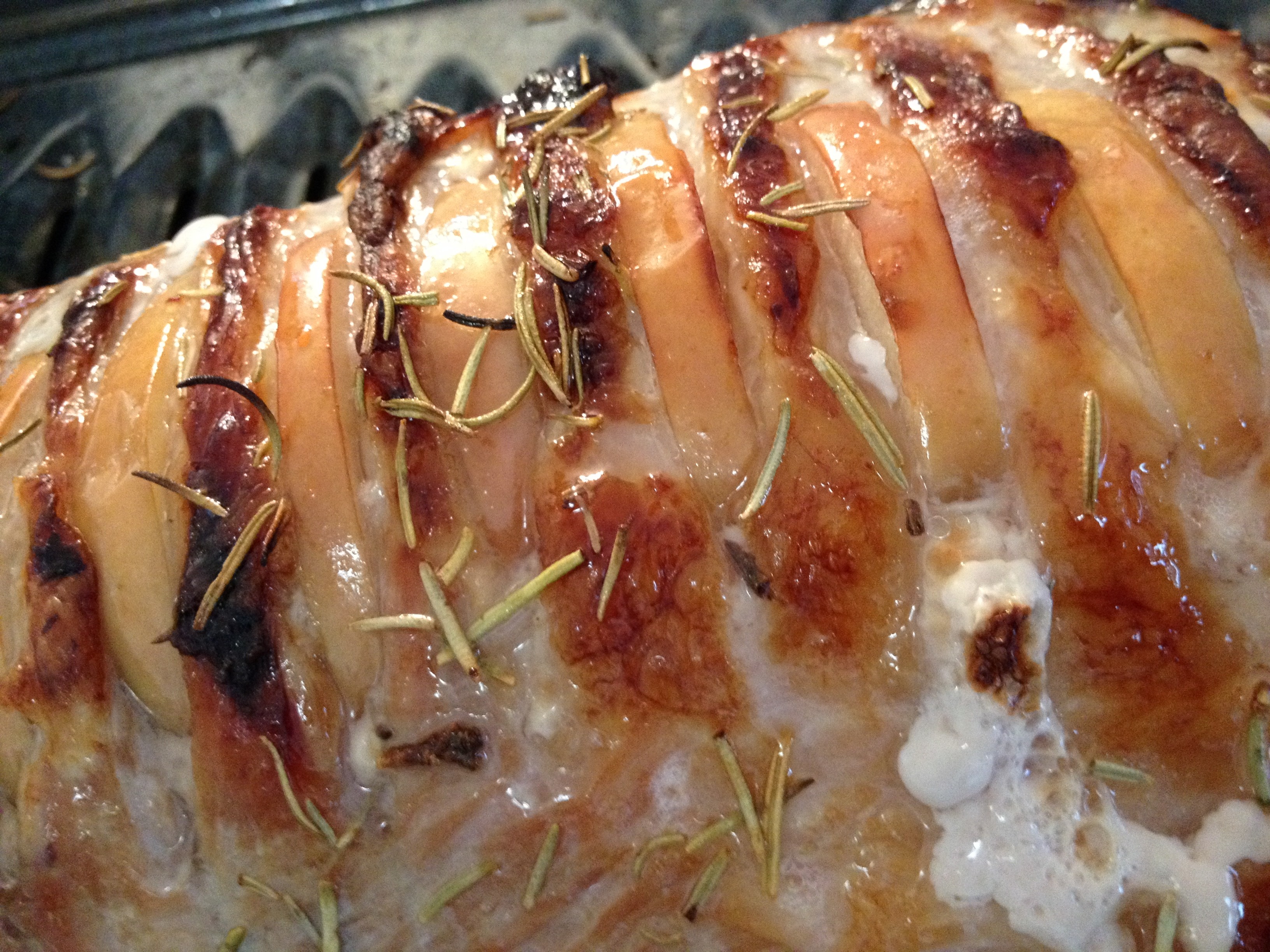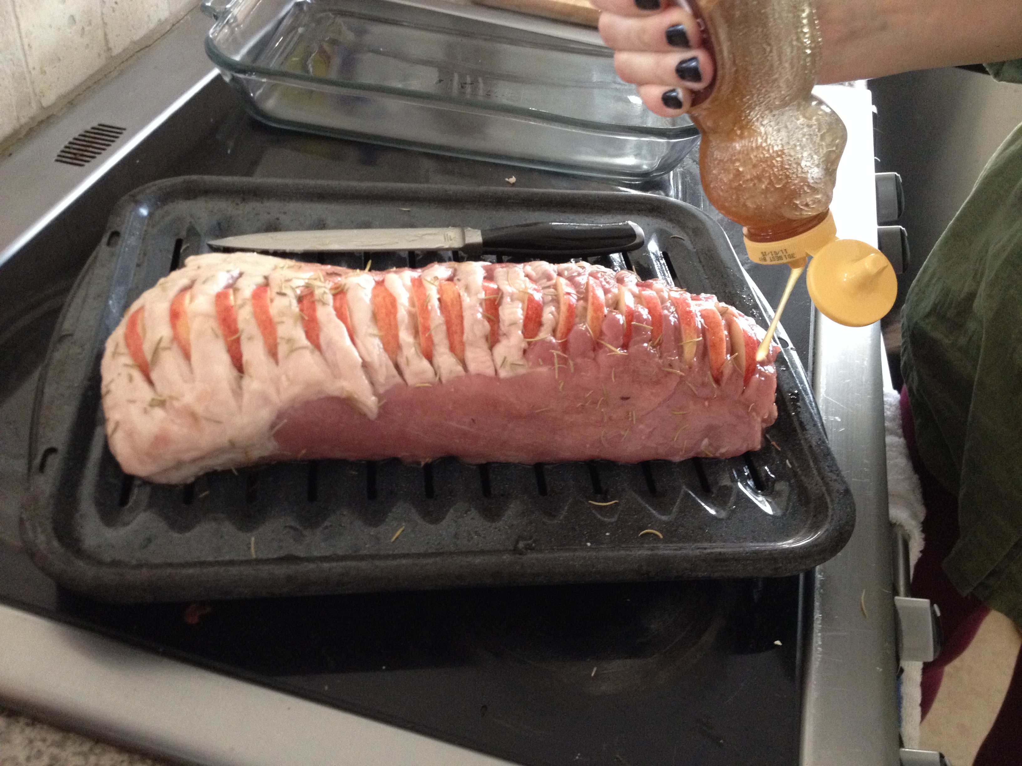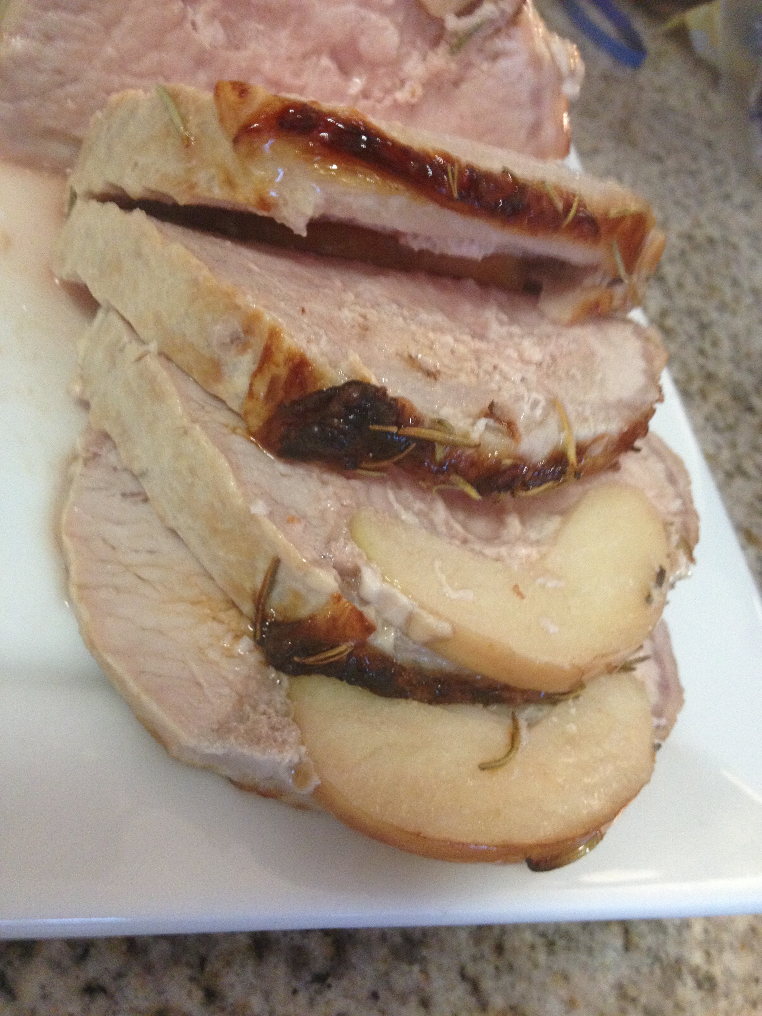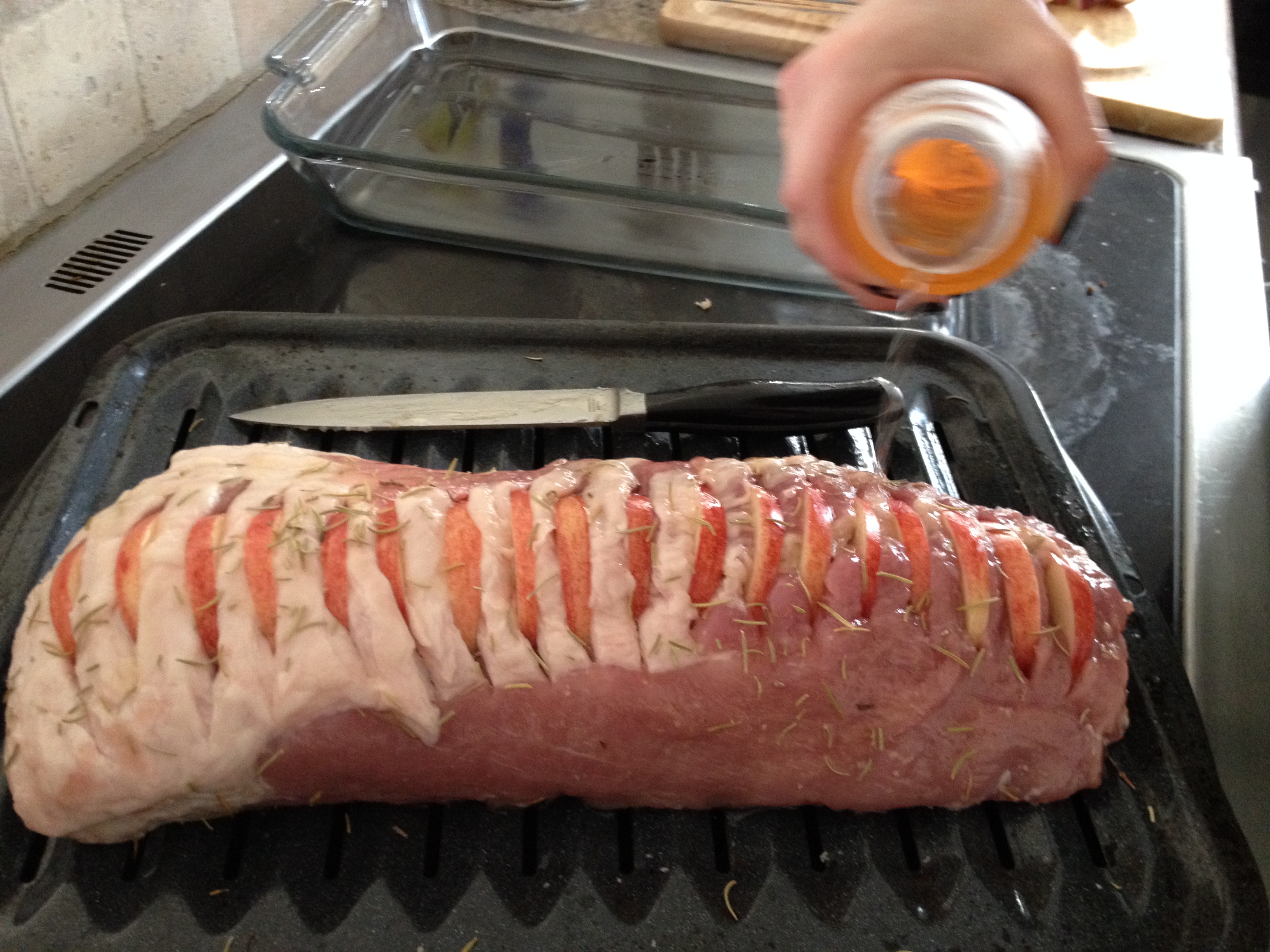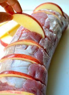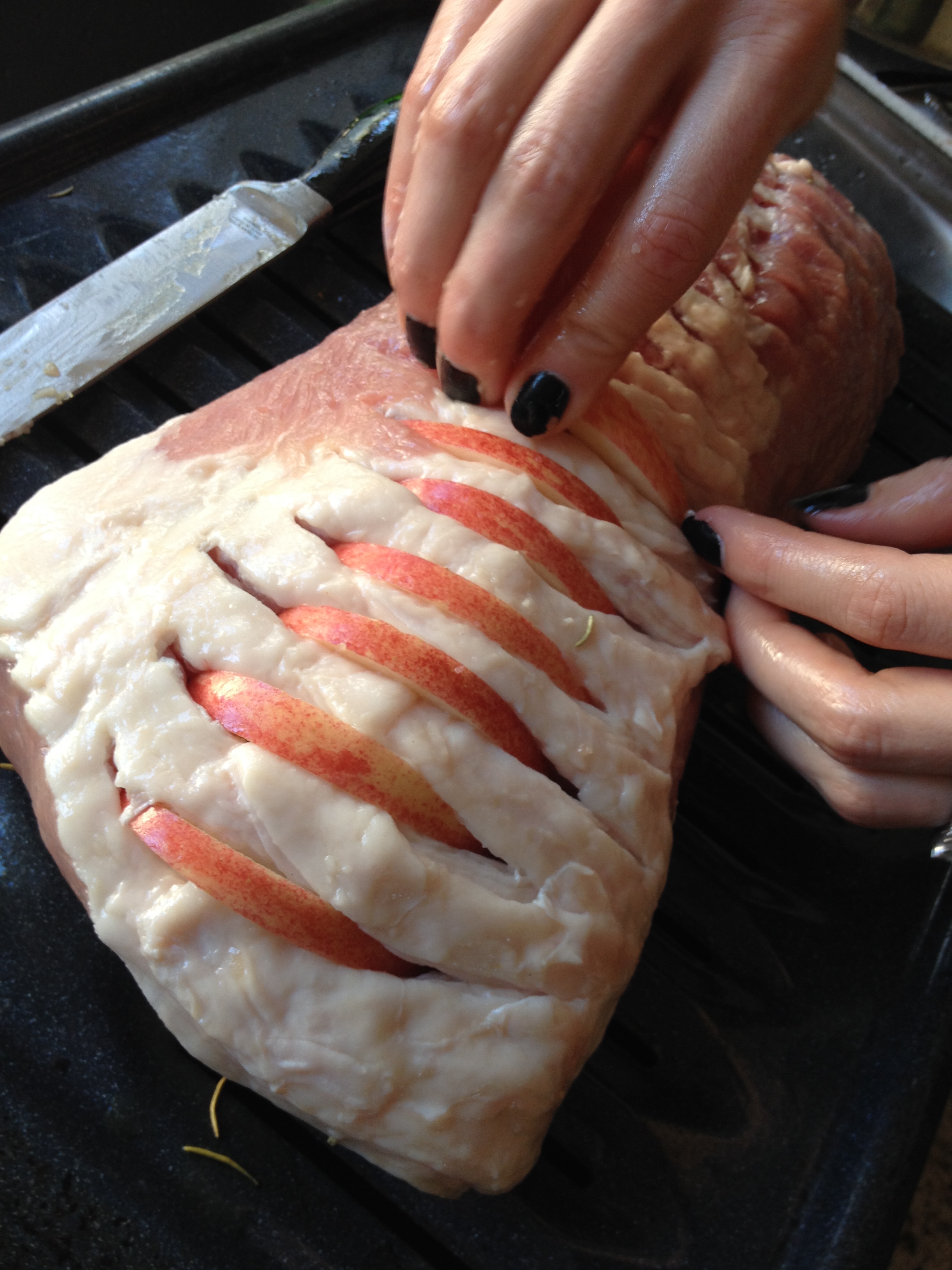 We then inserted the apple slices into the matching cuts on the pork loin.