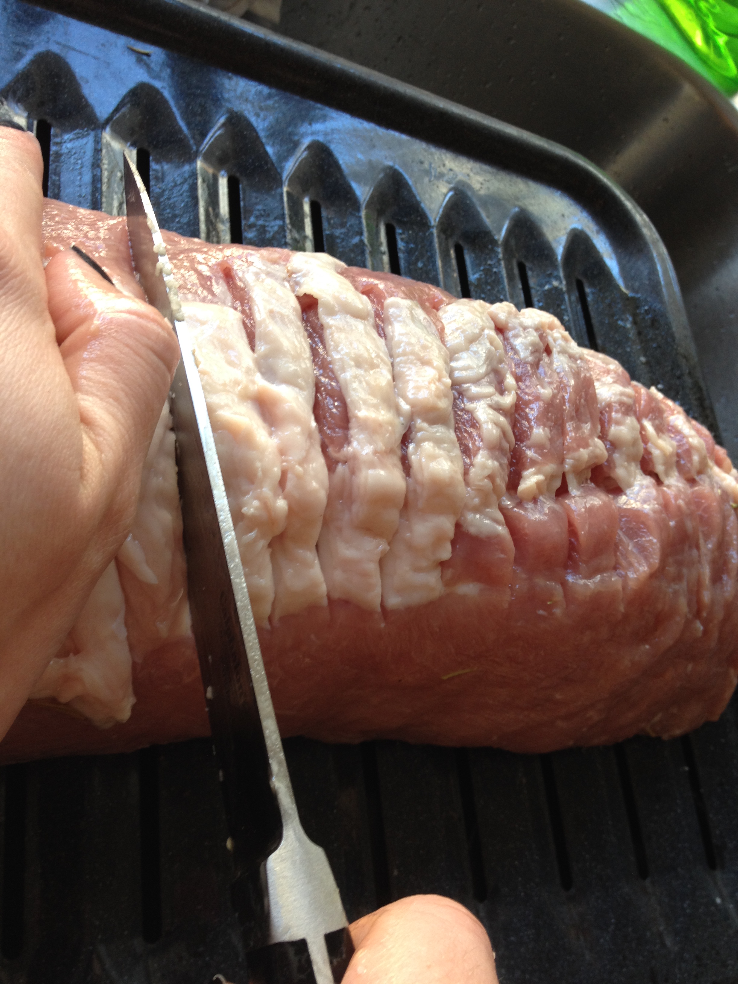 First, we rubbed each side of the pork loin with olive oil, and seasoned with salt and pepper. Next, we made incisions about every half inch, making sure the cuts corresponded with the height of our previously-sliced apples.