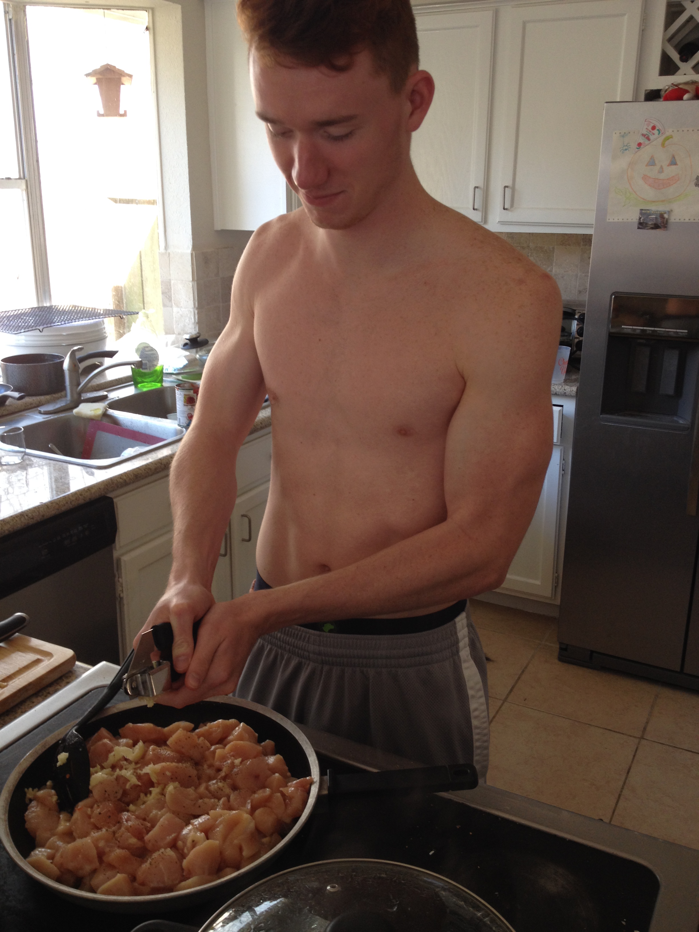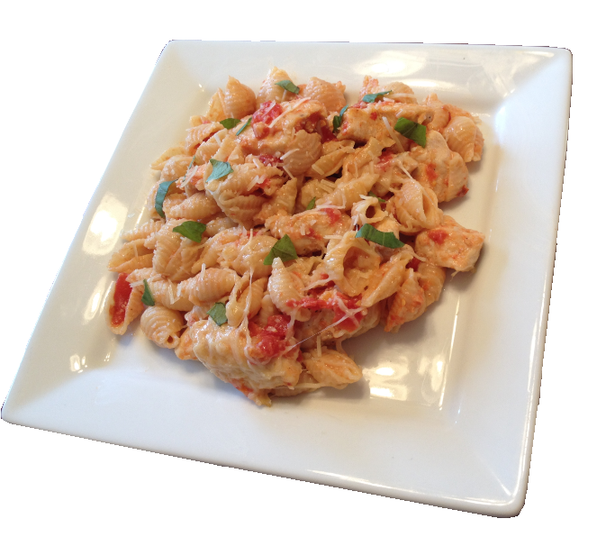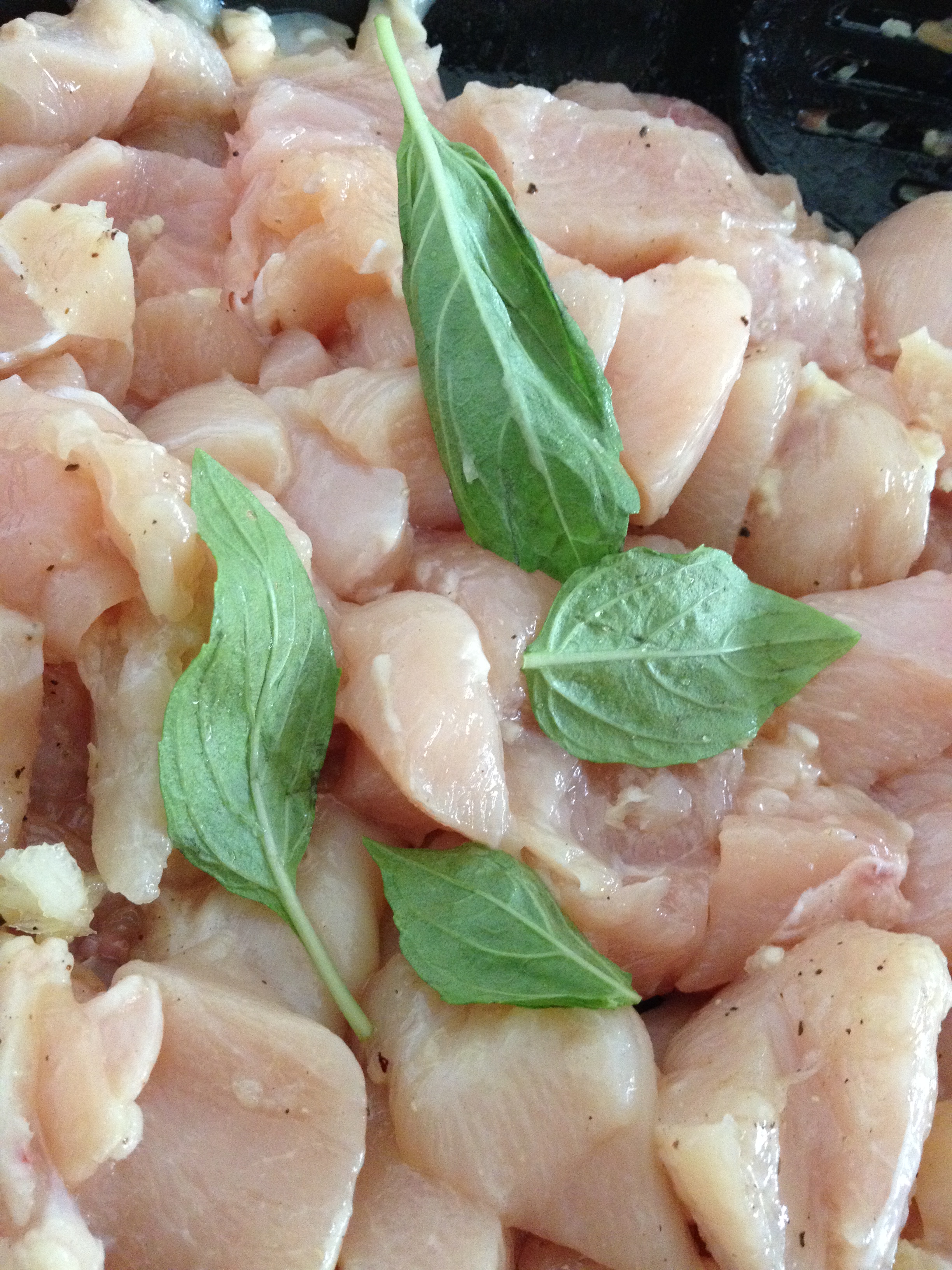 To begin our culinary adventure, we substituted the “tin fish” with deliciously lean and succulent chicken breast. Slicing the chicken into bite-size pieces, we sautéed it in olive oil, salt, pepper, four cloves of garlic, and five fresh basil leaves.