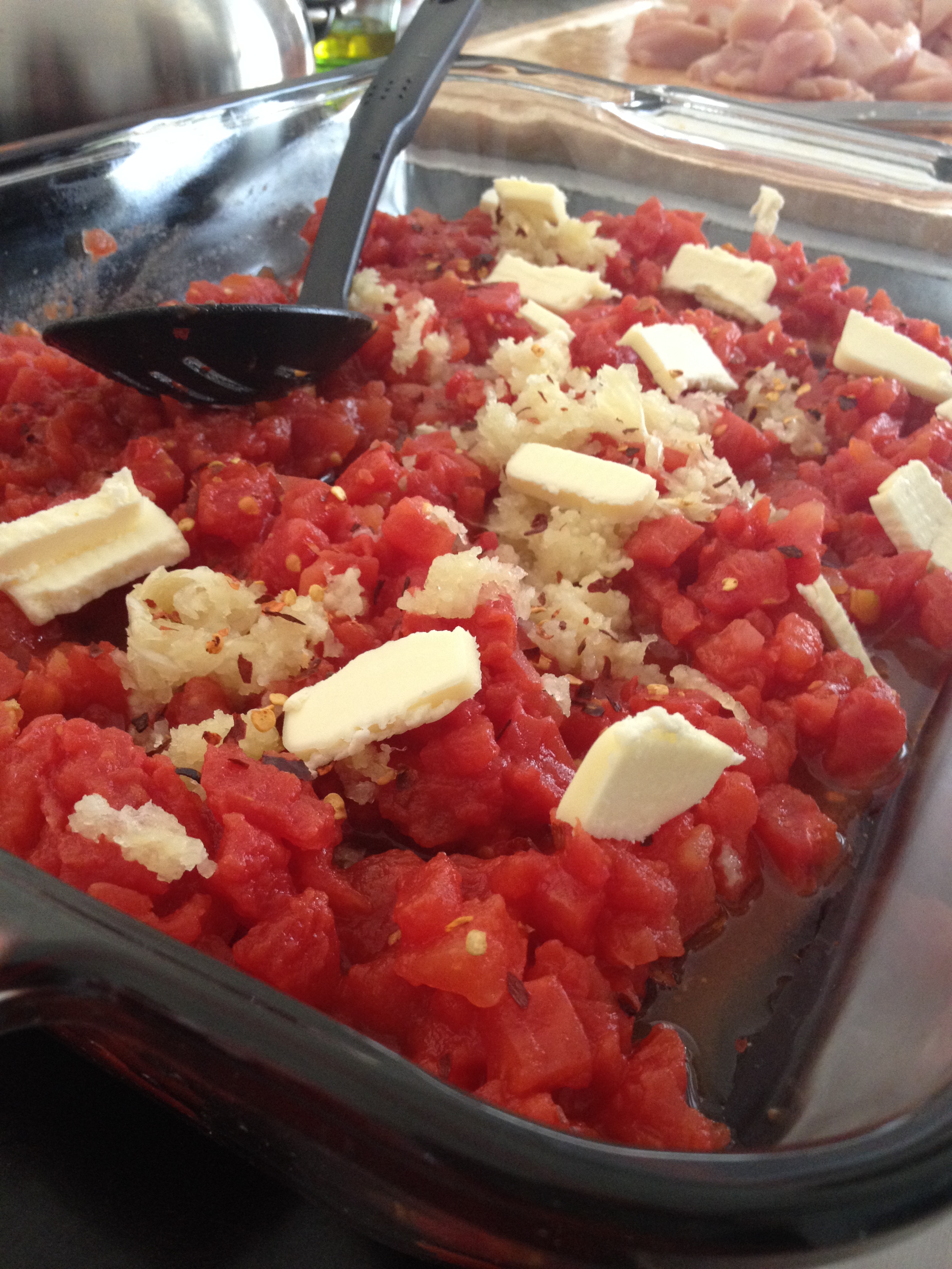 Spreading our tomatoes in a 9×12 casserole dish, we added 8 cloves of garlic, half a stick of butter, ¾ tsp. red pepper flakes, and salt and pepper to taste. We roasted the medley at 425 degrees for roughly 35 minutes, stirring occasionally.
