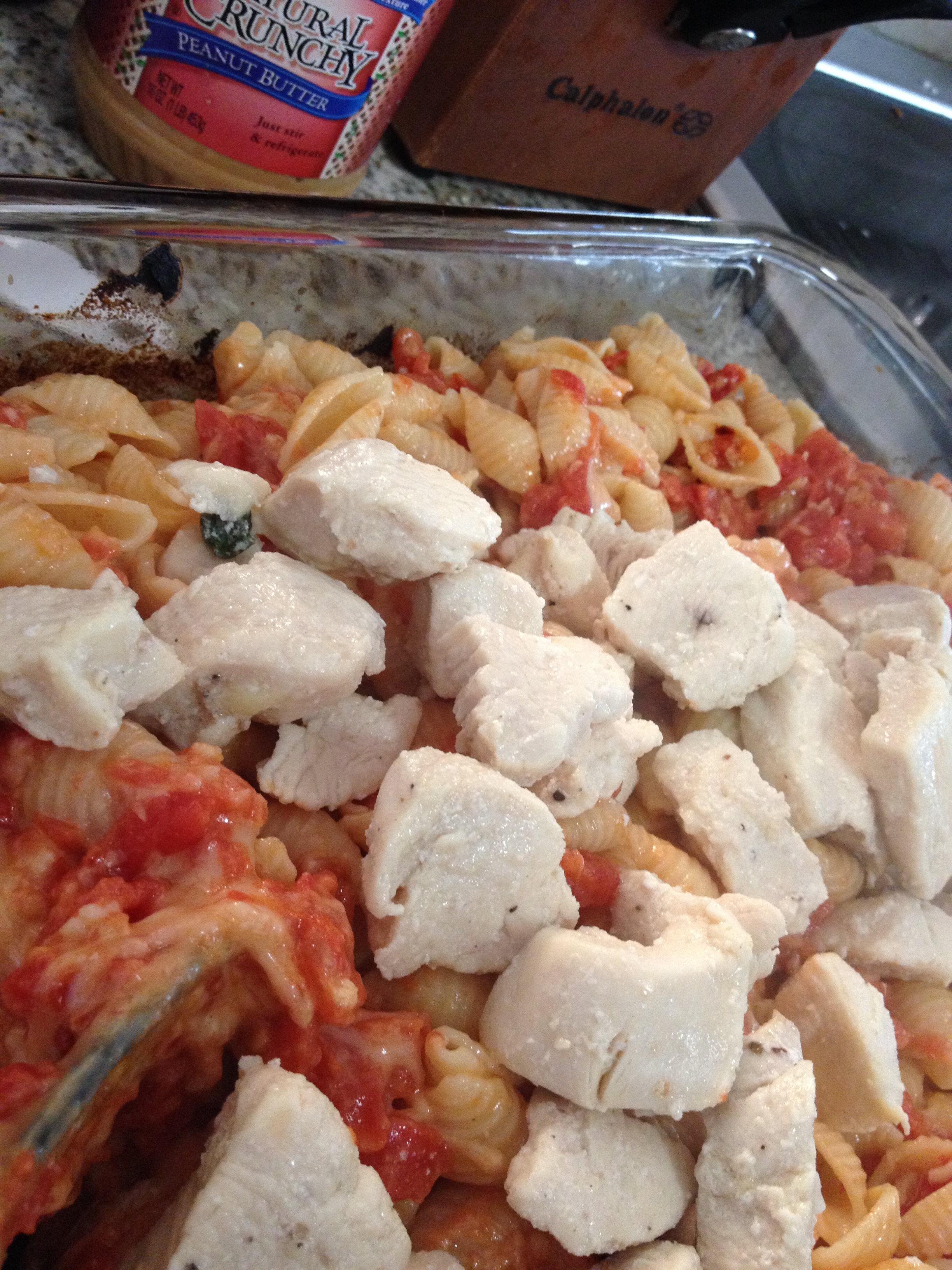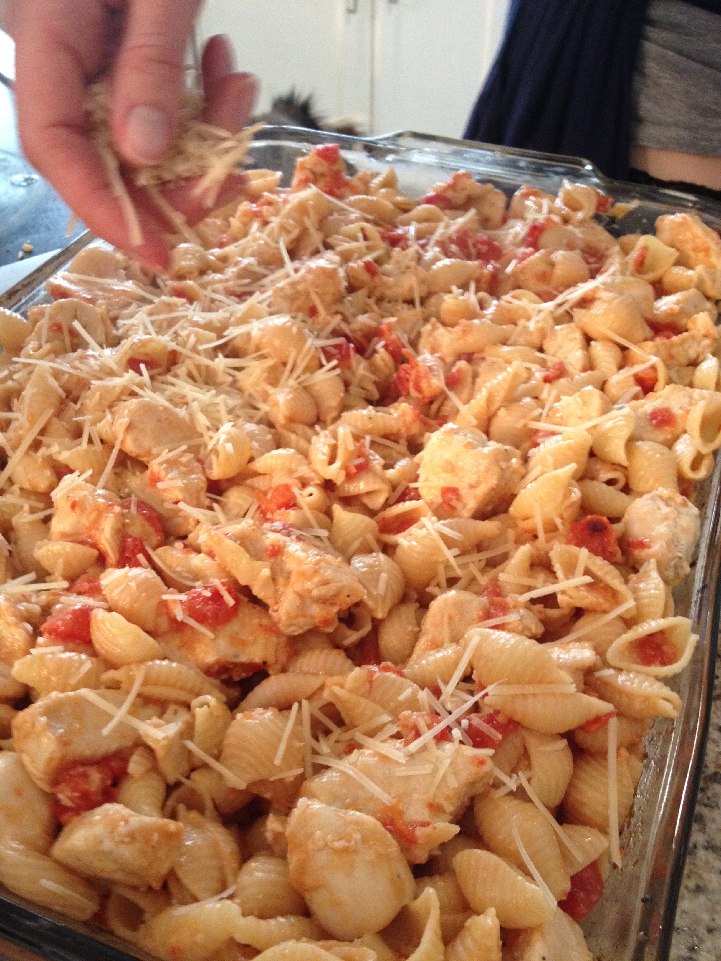 Next, making use of the previously-utilized casserole dish, we blended the chicken and a half cup of chicken broth with the pasta mixture. And we stirred…and stirred… and stirred!