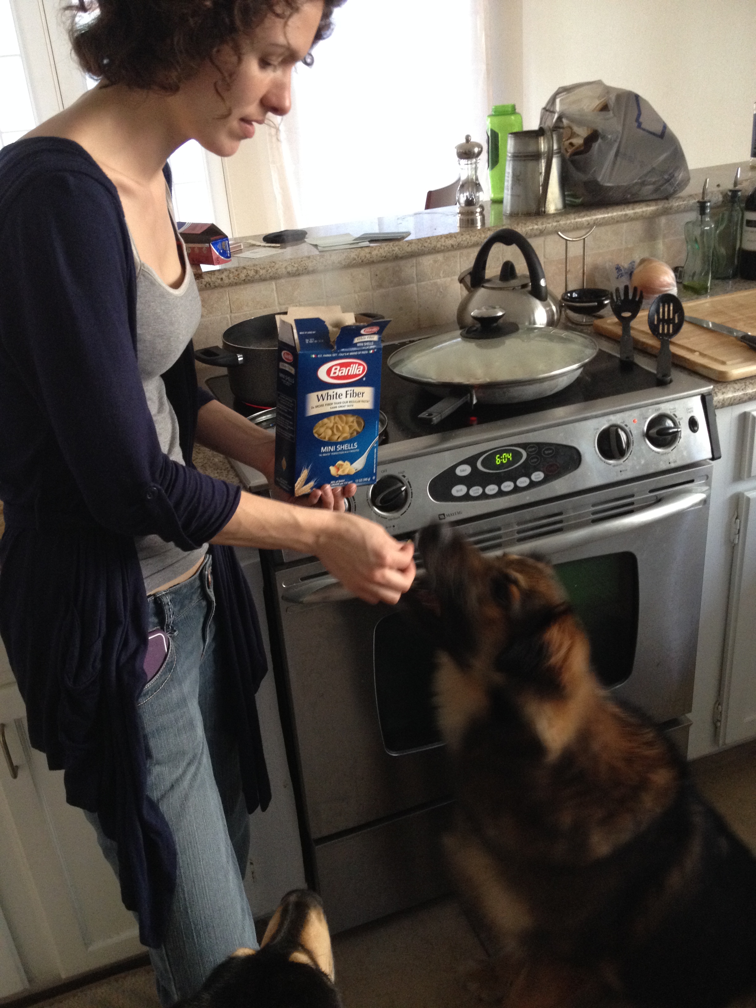 Meanwhile, we boiled the pasta using the specifications on the box, making sure to reward our faithful sous chef.