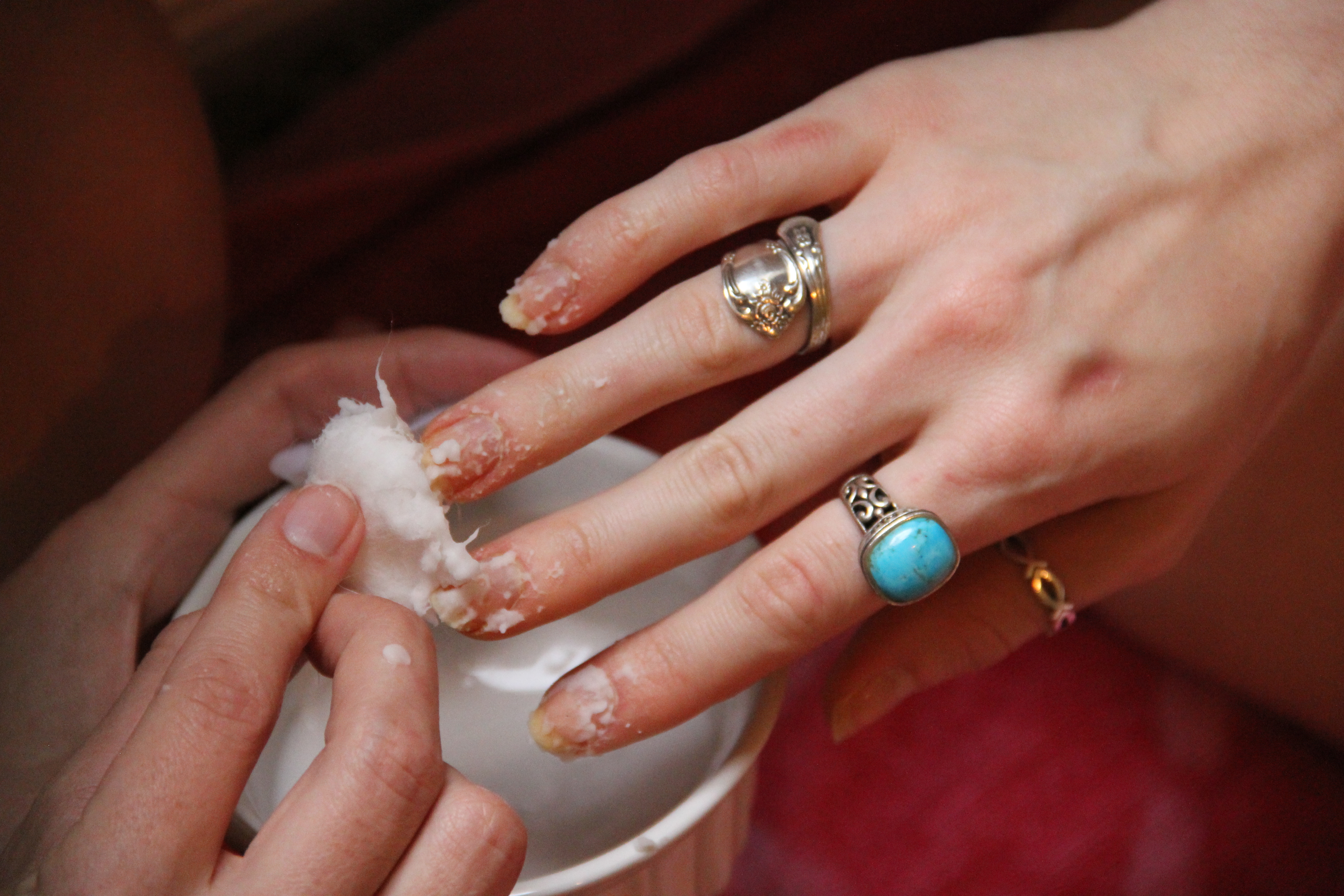 Next, apply the substance to the tops of your nails, as well as making sure to fully saturate under your nail bed.