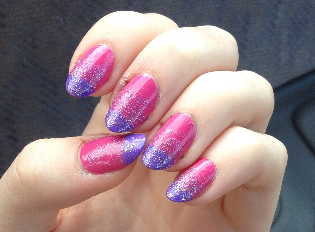 First, I started off with two coats of Isaac Mizrahi Fabulous Pink (2341) polish; after the pink was sufficiently dry, I swiped two coats of purple on at the tips. The purple is terribly cheap Forever 21 polish, but as long as you implement some sort of polish with shine over top it looks ok. I applied the purple in the same fashion as you would for a typical French tip, and then added a silver sparkle polish called Sally Hansen Gem Crush Big Money (03). The sparkles I concentrated at the tips and faded out as it approached the nail bed.