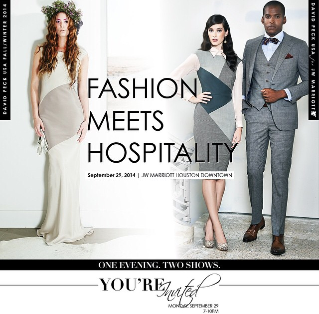 This particular event was a collaboration between David Peck USA, an American fashion house who, with the help of about twenty-five employees, creates an “unrivaled experience, adhering to the values of the consumer while remaining flexible to the demands of the traditional fashion calendar,” the JW Marriott Houston, and Suit Supply. David Peck designed the new uniforms for the Marriott’s employees, and they provided the venue for the release of his new line. My friend Devon and I arrived at the Marriott, where I released my car into the capable hands of their valet, and we stepped into the cool interior of the the hotel. We made a quick stop for a press photo before we happily grabbed glasses of champagne from the servers lining the entrance, and proceeded to network with the other attendees. Hobnobbing has never been something I particularly enjoy (which is unfortunate since the only way to get in anywhere in this world seems to be via connections), so I was overjoyed to run into Clinton, a long-time friend from college. He works for Suit Supply and assisted in putting together the menswear line featured in the show; he also freed me from a “riveting” chat about Houston mayors. After flitting about chatting, I snagged two of our models for a photo; you may recognize Alex (middle) from his work for Bloomingdale’s, J.Crew, and Target, among numerous others.