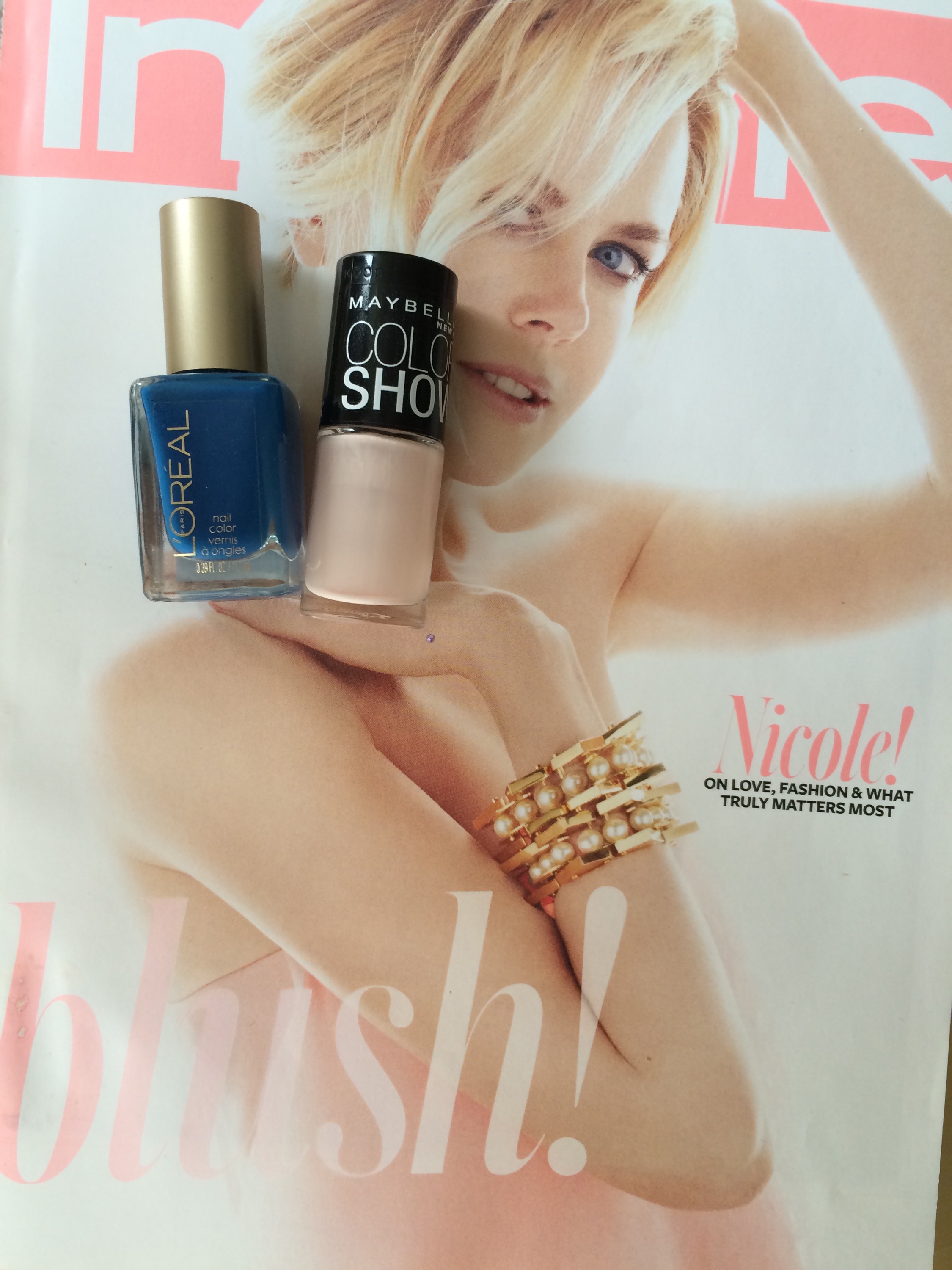 I used my favorite blue EVER, by L’Oreal (Jet Set to Paris 540) and this beautiful sheer pink by Maybelline New York (Born With It 150).