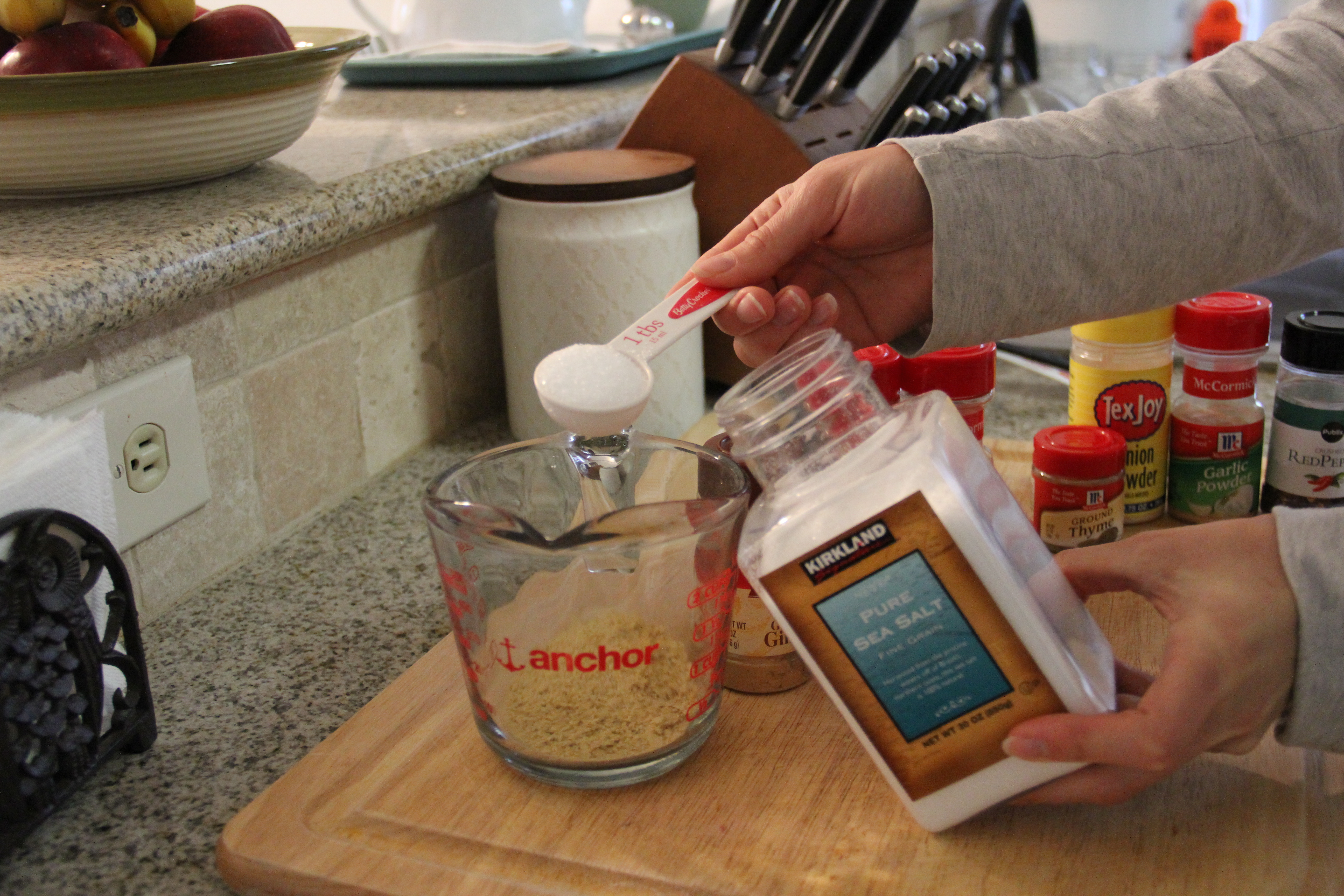 All of the spices are used to make homemade dry bouillon. Measure the Nutritional Yeast, Sea Salt, Onion Powder, Garlic Powder, Thyme, Sage, Paprika, Turmeric, and Ginger into a bowl.