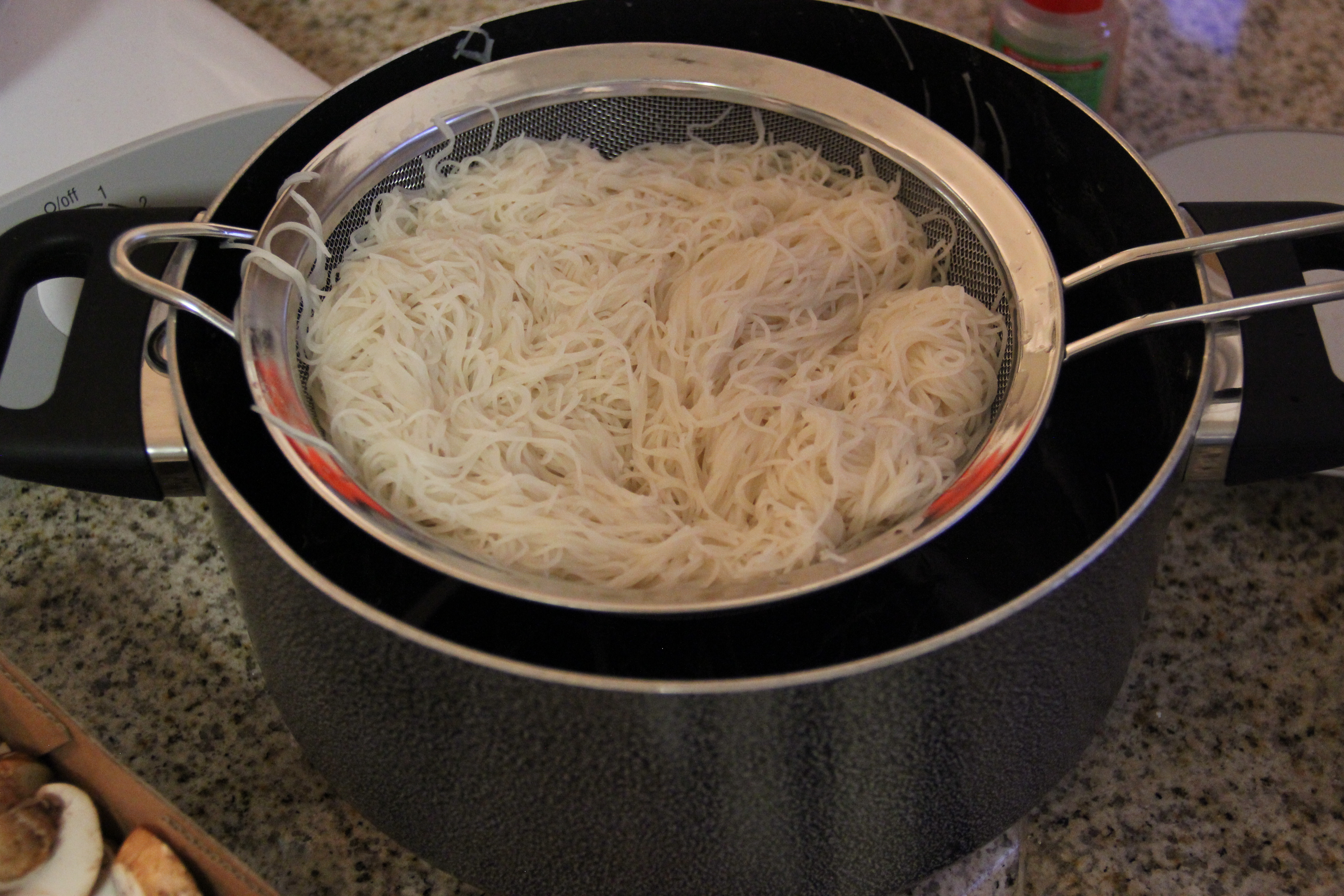 After the noodles are sufficiently cooked, strain and rinse them under cold water to stop them from overcooking.
