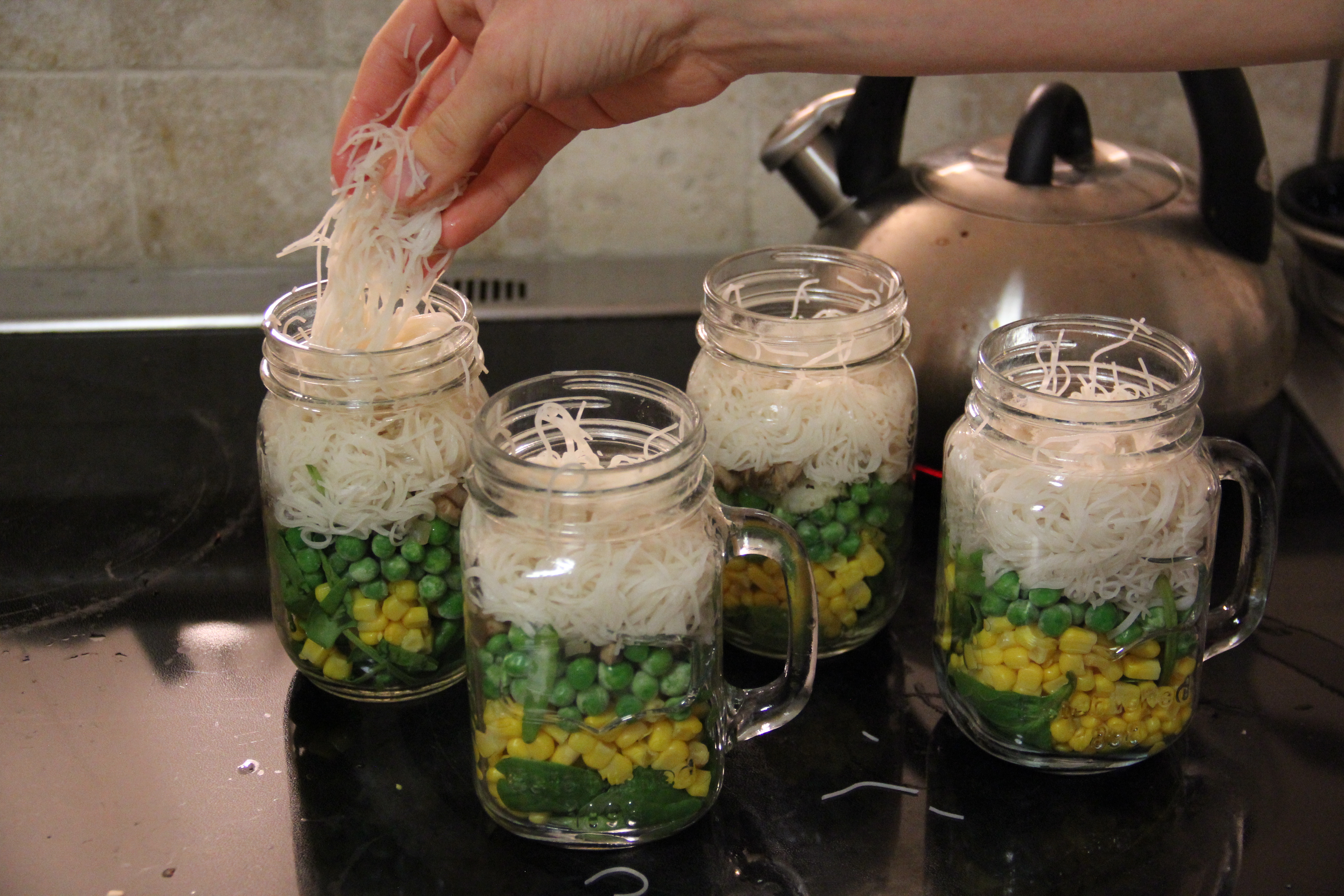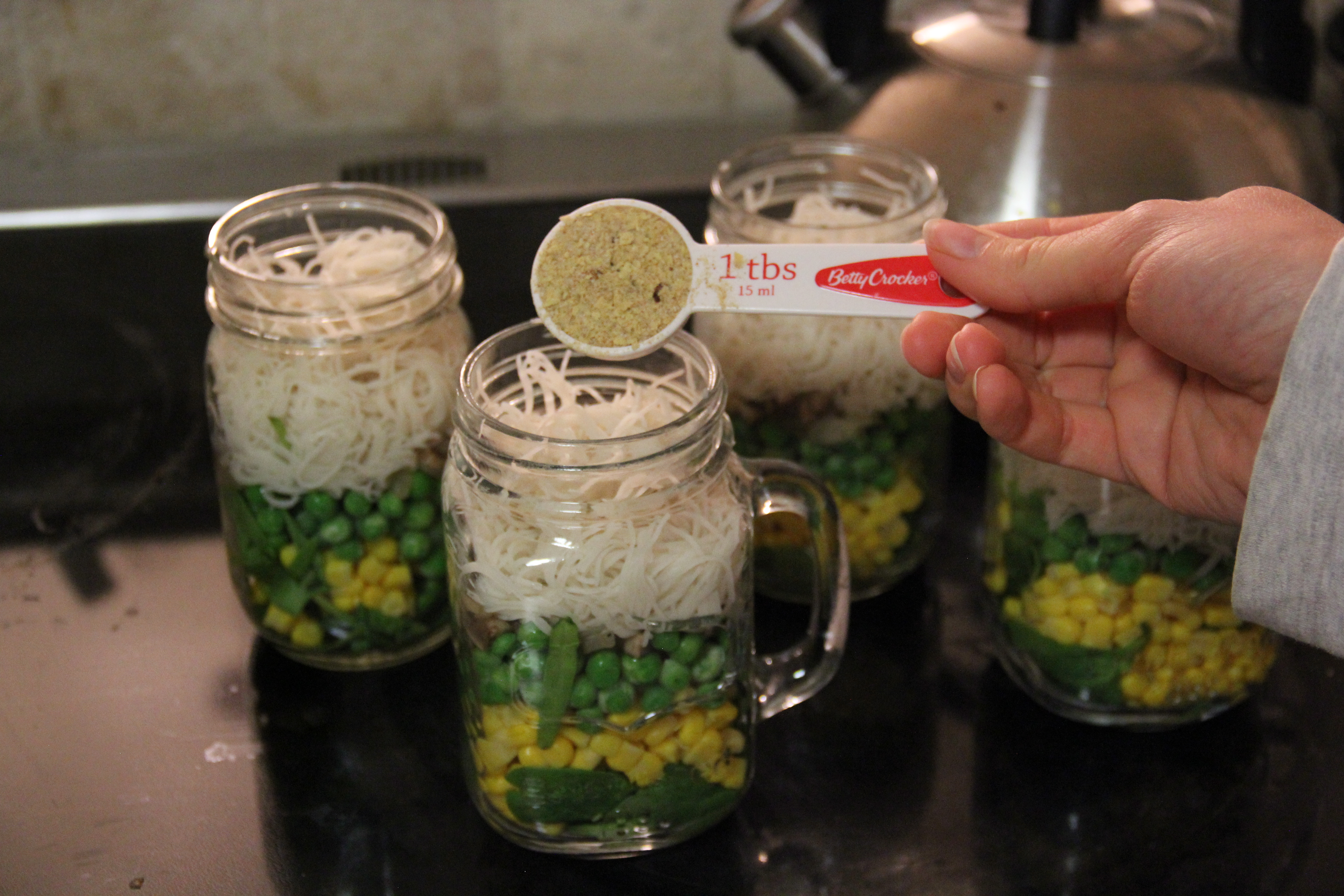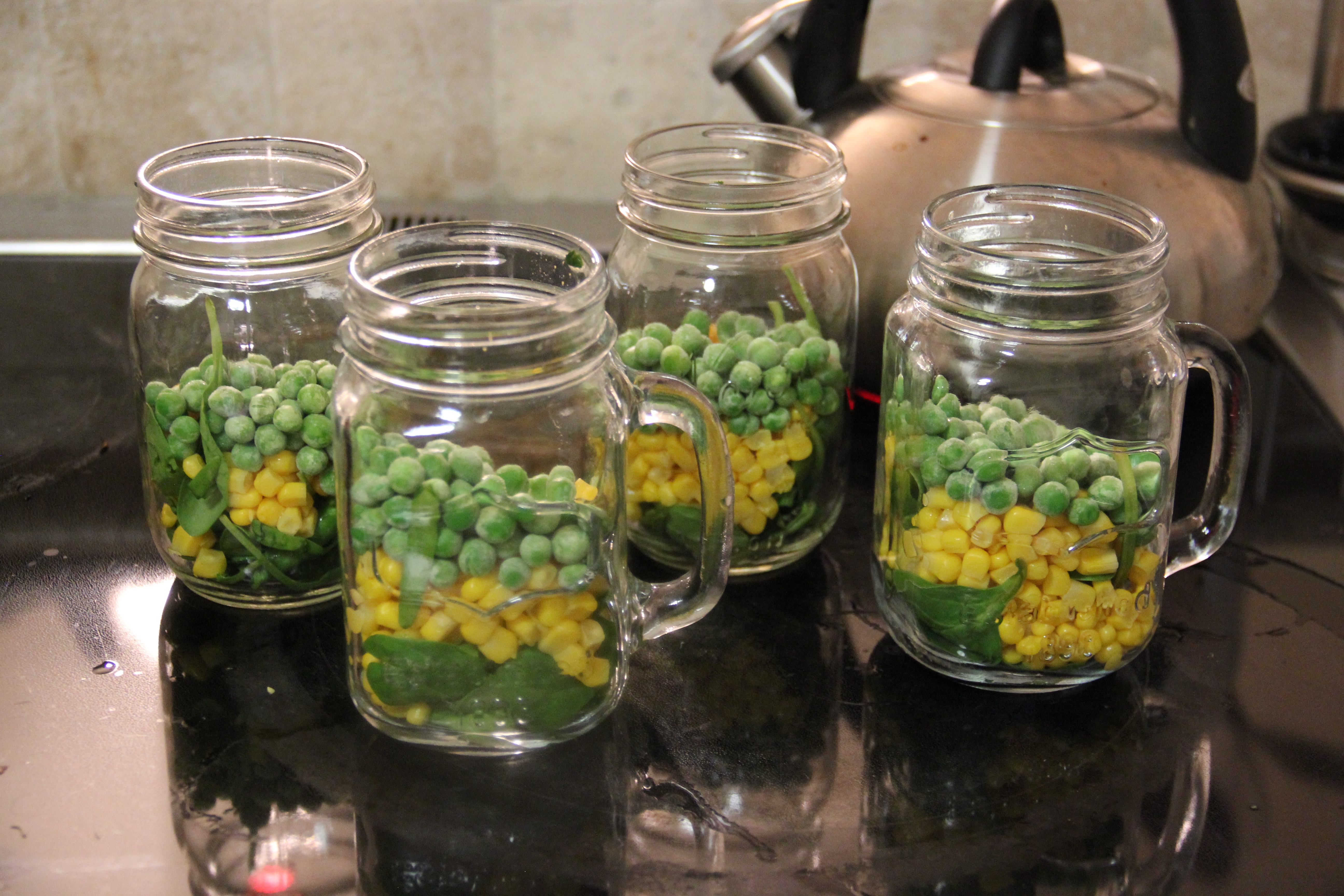 Next comes the fun part! Take your jars and layer them with the desired veggies; if you have picky eaters “cough, cough”, they may prefer you leave some of the vegetables out of their cups. I happen to dislike onions and mushrooms, so we left those particular ones out of my cup. First, we put in 1/2 cup of spinach, 1/4 cup of corn, 1/4 cup of peas, and 1/4 cup of the onion-mushroom mixture.