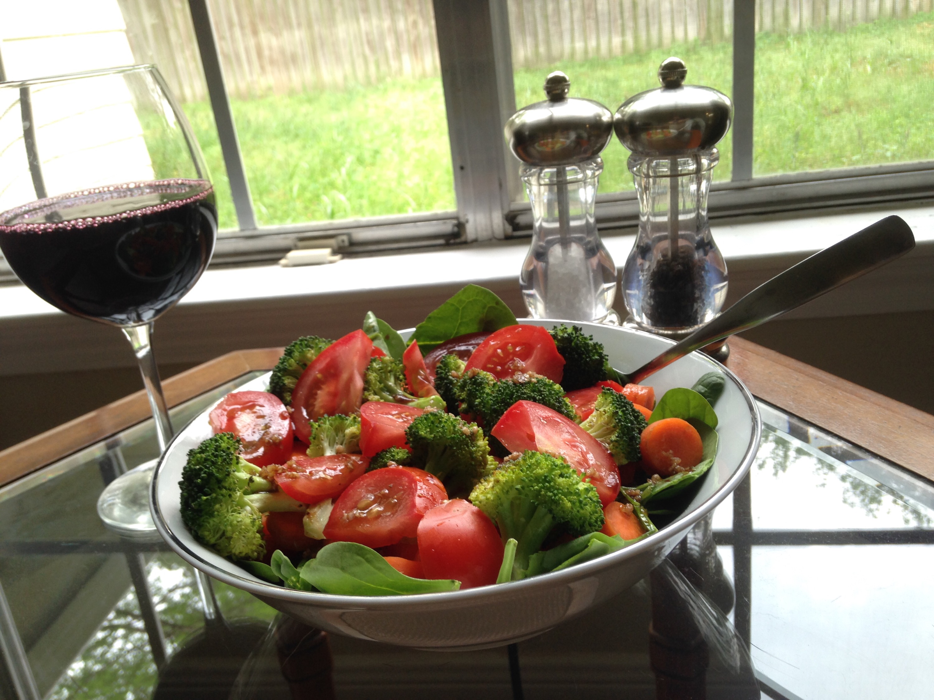 I started with some whole wheat orzo, though brown rice would be another great option. As the orzo cooked (according to directions on the package), I raided my fridge for any salad type vegetables, turning up broccoli, carrots, red pepper, tomatoes and spinach. Deciding to increase the warmth factor by slightly roasting the broccoli, I preheated the oven to 425 degrees. Basting with a little olive oil and sprinkling with salt and pepper, I cooked it for seven minutes. While waiting for the orzo and broccoli, I chopped the remaining veggies, and made the “salad dressing”. In my opinion, less is often more when it comes to flavors, so my dressing was a couple tablespoons of olive oil with a tablespoon of balsamic vinegar and a clove of garlic (if you’re not garlic-obsessed, you might want to leave that out).
